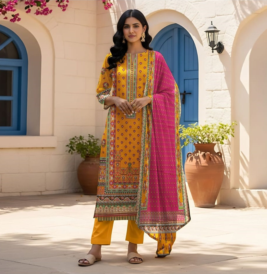 Refresh your wardrobe this season with our Digital Khaddar 3 Piece Unstitched Suit. It includes a soft digital printed khaddar shirt, a stylish printed khaddar dupatta, and a plain dyed trouser — a perfect blend of comfort and seasonal style.