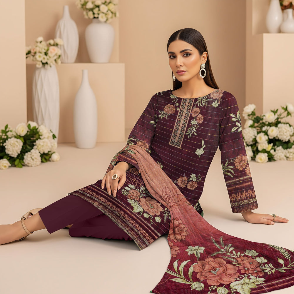 The Looms Digital Printed Cotton Khaddar 3 Piece Suit is designed with a beautifully printed shirt and matching printed dupatta paired with a plain dyed trouser. The premium cotton khaddar fabric gives warmth and comfort while keeping your look chic and graceful — ideal for winter wear, casual events or semi-formal gatherings.