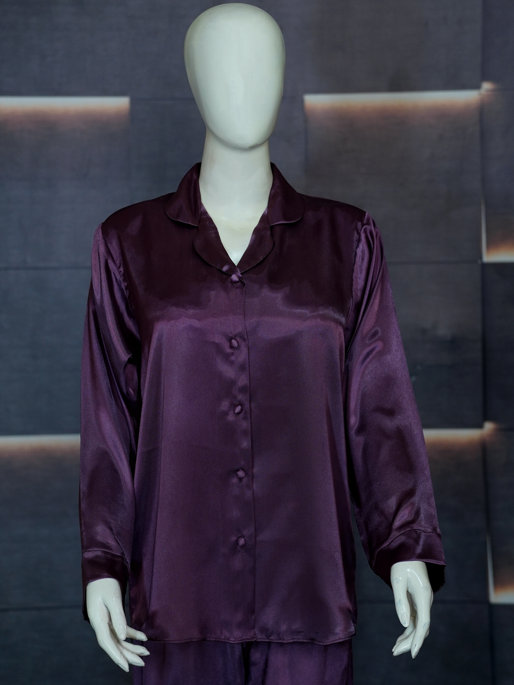 Experience luxury and comfort with this women’s maroon silk night suit, designed to bring elegance to your bedtime routine. The soft, smooth silk fabric feels gentle on the skin, while the classic button-down shirt and relaxed trousers ensure a comfortable fit all night long. Perfect for lounging, sleeping, or gifting.