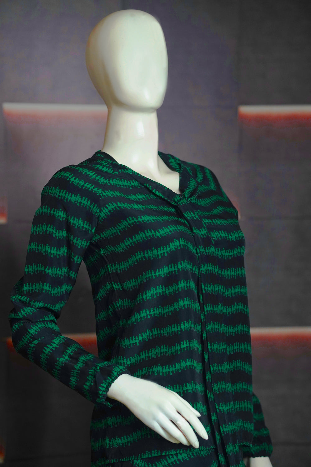 Matching green printed shirt and skirt set for a coordinated outfit. Perfect for festive gatherings and events.