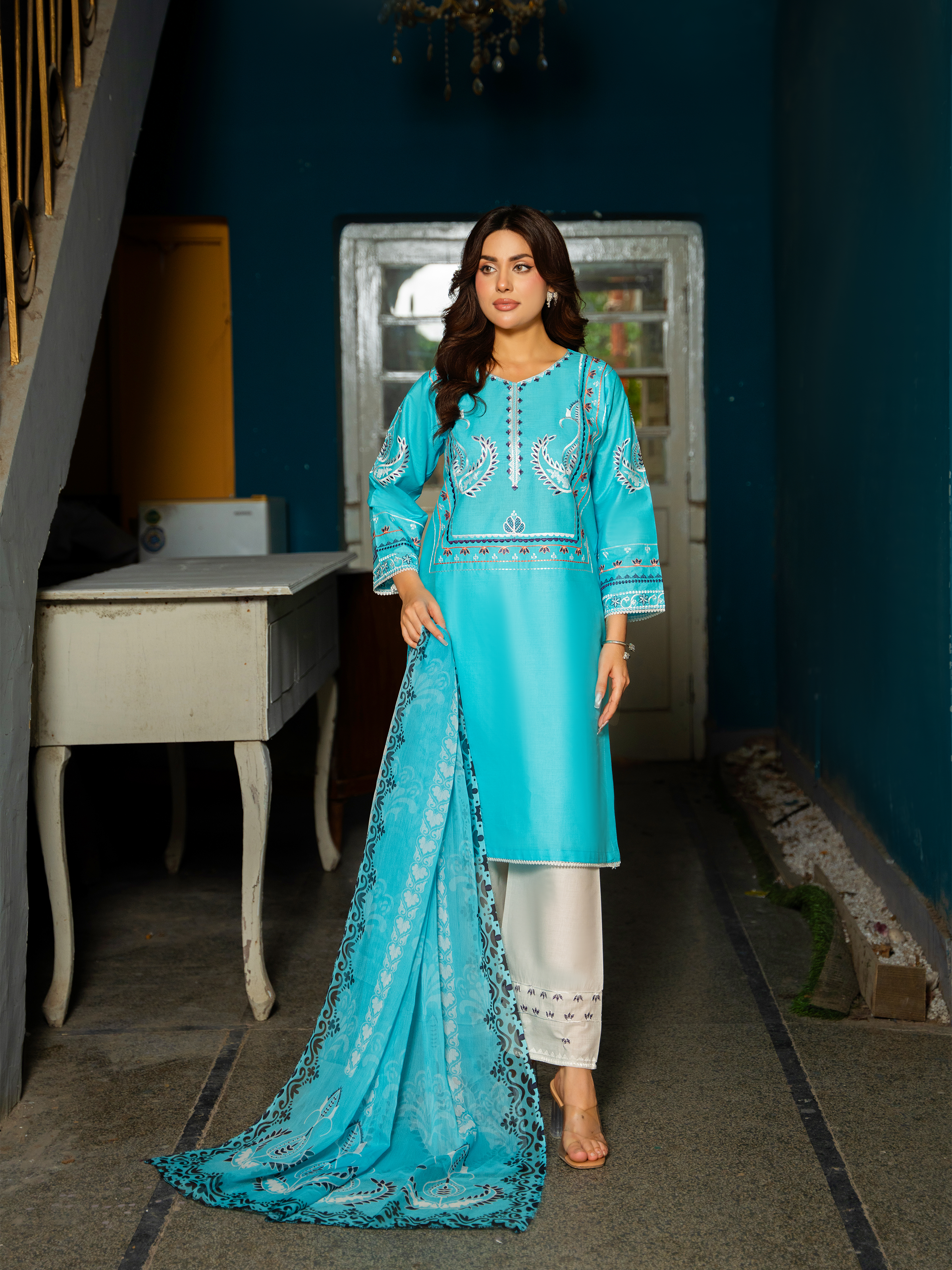 Step into timeless elegance with this stunning turquoise embroidered lawn suit from Kahani47. Crafted with intricate white and silver threadwork, the shirt features delicate motifs and a refined border, paired with a matching dupatta that adds a graceful flair. The pure white trousers are adorned with subtle embroidery, bringing a harmonious contrast and contemporary appeal to the ensemble. Perfect for festive gatherings, daytime events, or chic everyday wear, this outfit combines comfort, style, and tradition, ensuring you leave a lasting impression wherever you go.