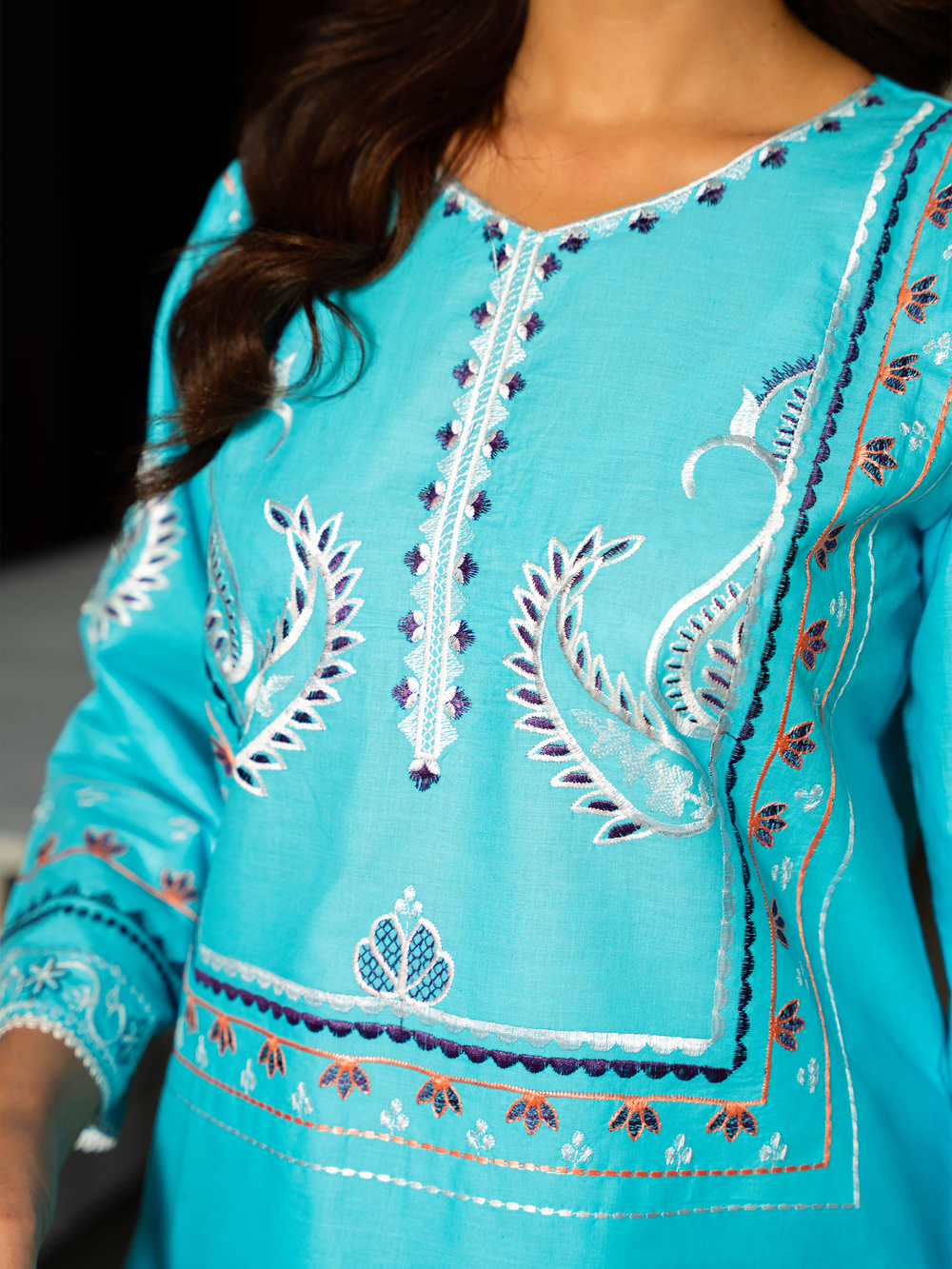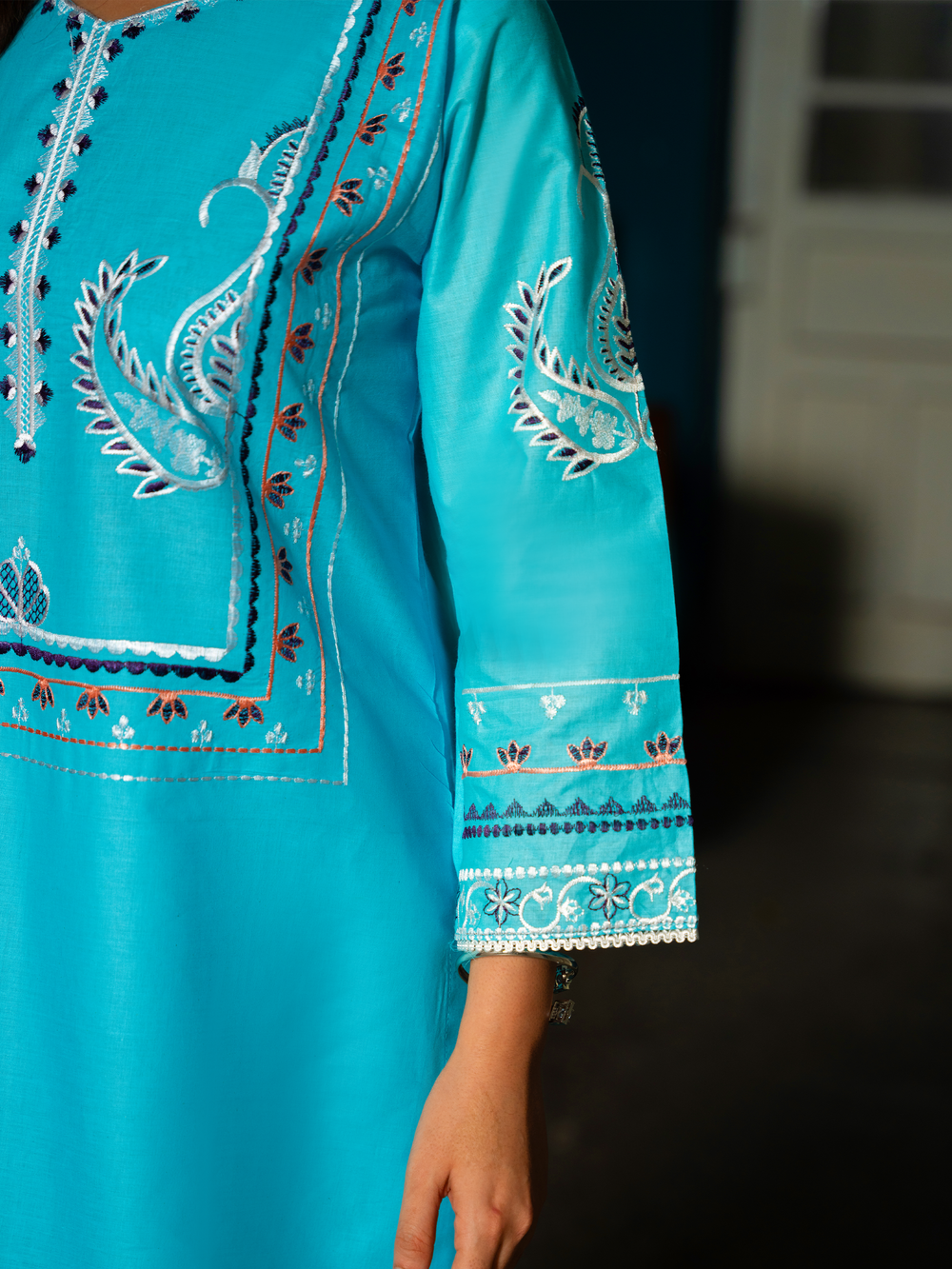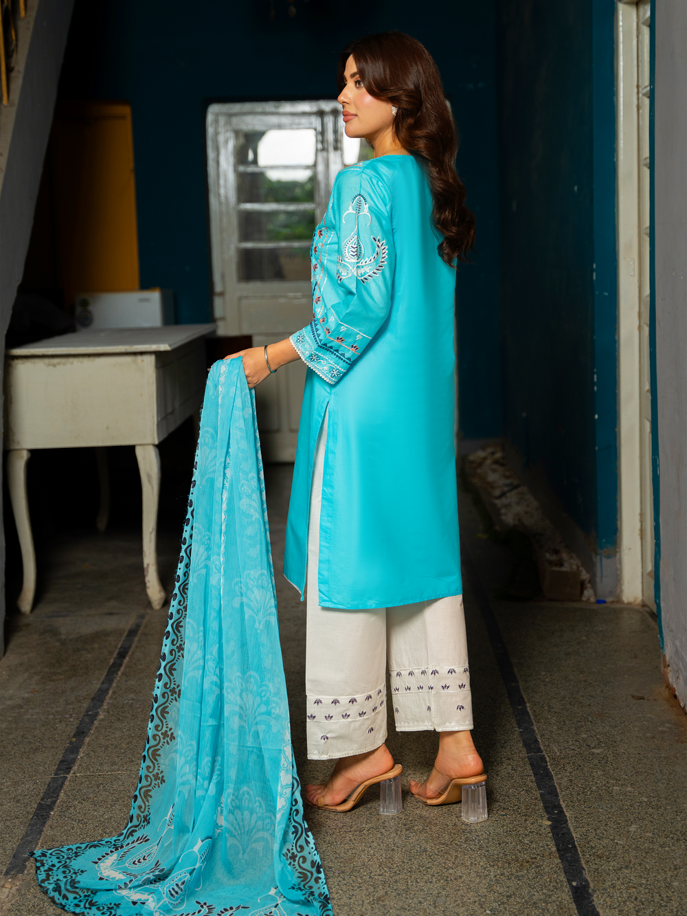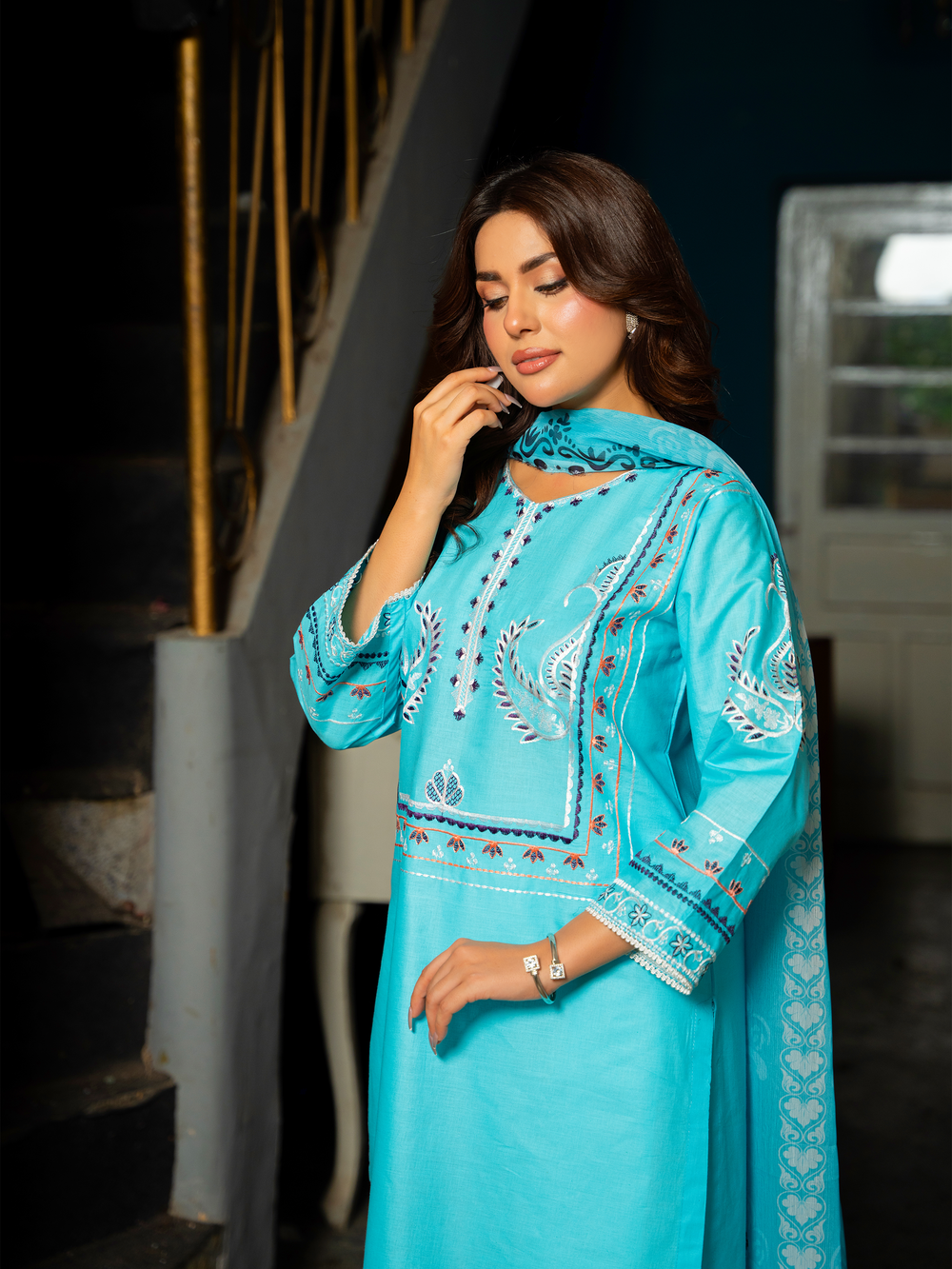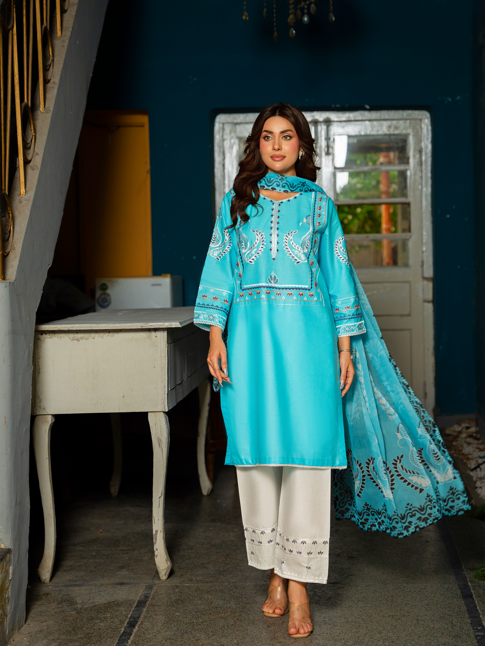 Step into timeless elegance with this stunning turquoise embroidered lawn suit from Kahani47. Crafted with intricate white and silver threadwork, the shirt features delicate motifs and a refined border, paired with a matching dupatta that adds a graceful flair. The pure white trousers are adorned with subtle embroidery, bringing a harmonious contrast and contemporary appeal to the ensemble. Perfect for festive gatherings, daytime events, or chic everyday wear, this outfit combines comfort, style, and tradition, ensuring you leave a lasting impression wherever you go.