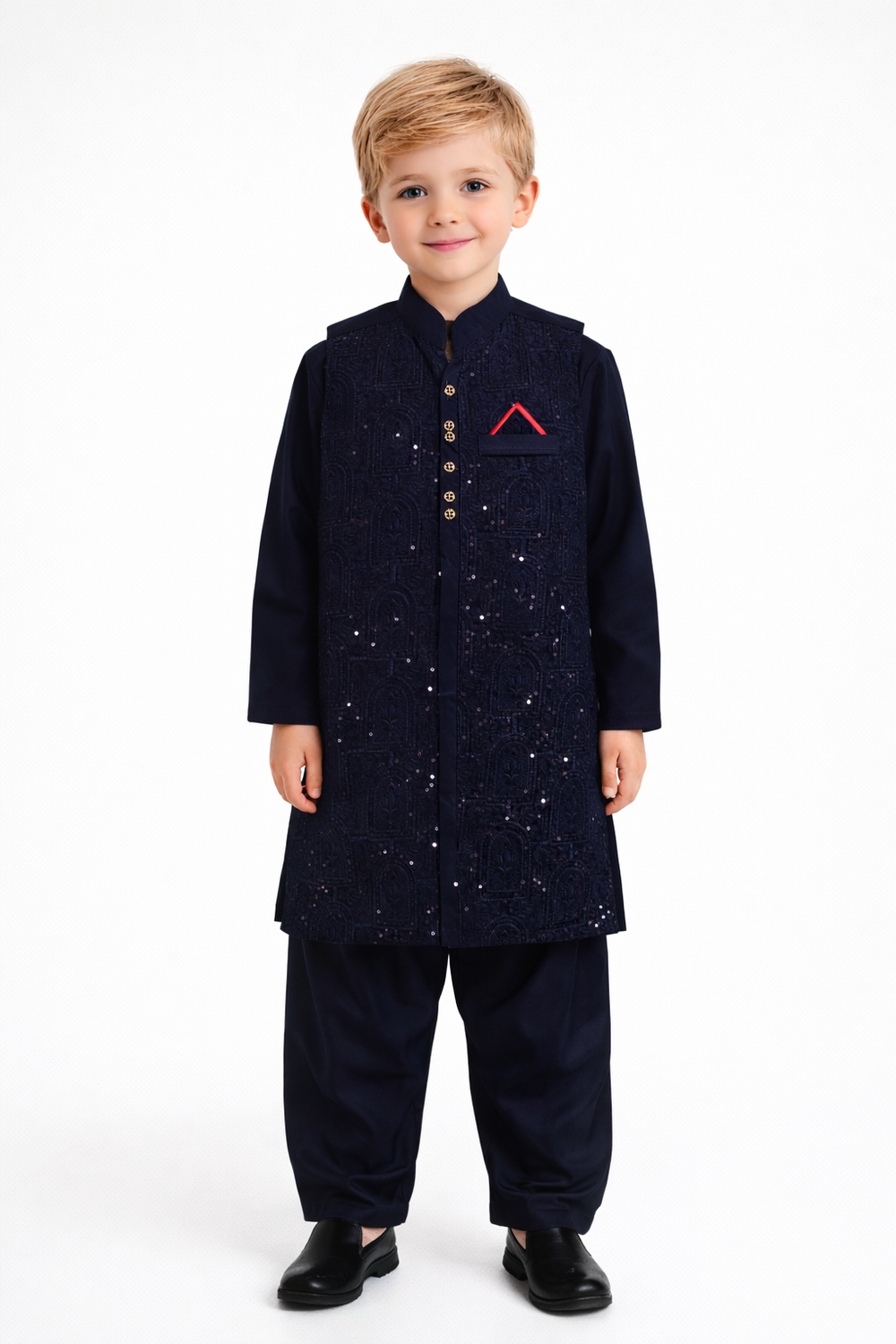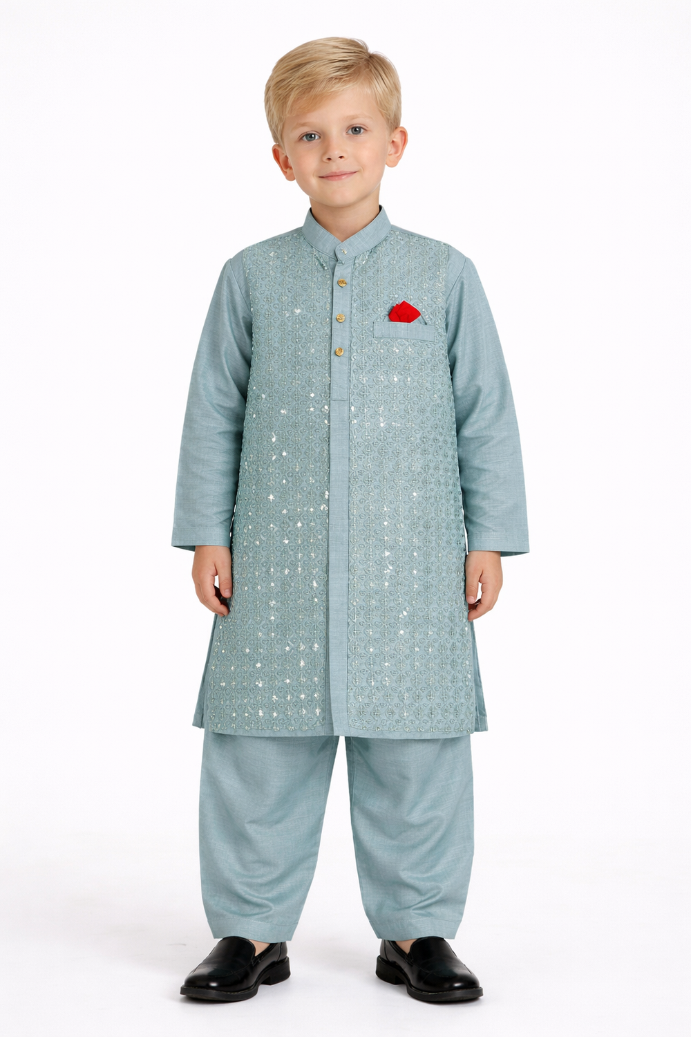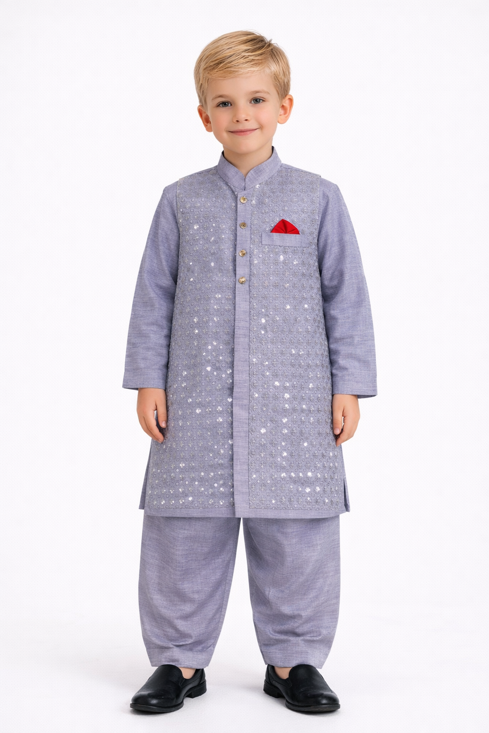 Give your little one a refined and festive look with this elegant traditional kurta suit, designed to blend classic charm with modern style. The kurta features intricate all-over embroidery with subtle sequin detailing that adds a soft festive shine. A mandarin collar and decorative button placket enhance the sophisticated appearance, while the contrasting pocket square adds a stylish finishing touch.