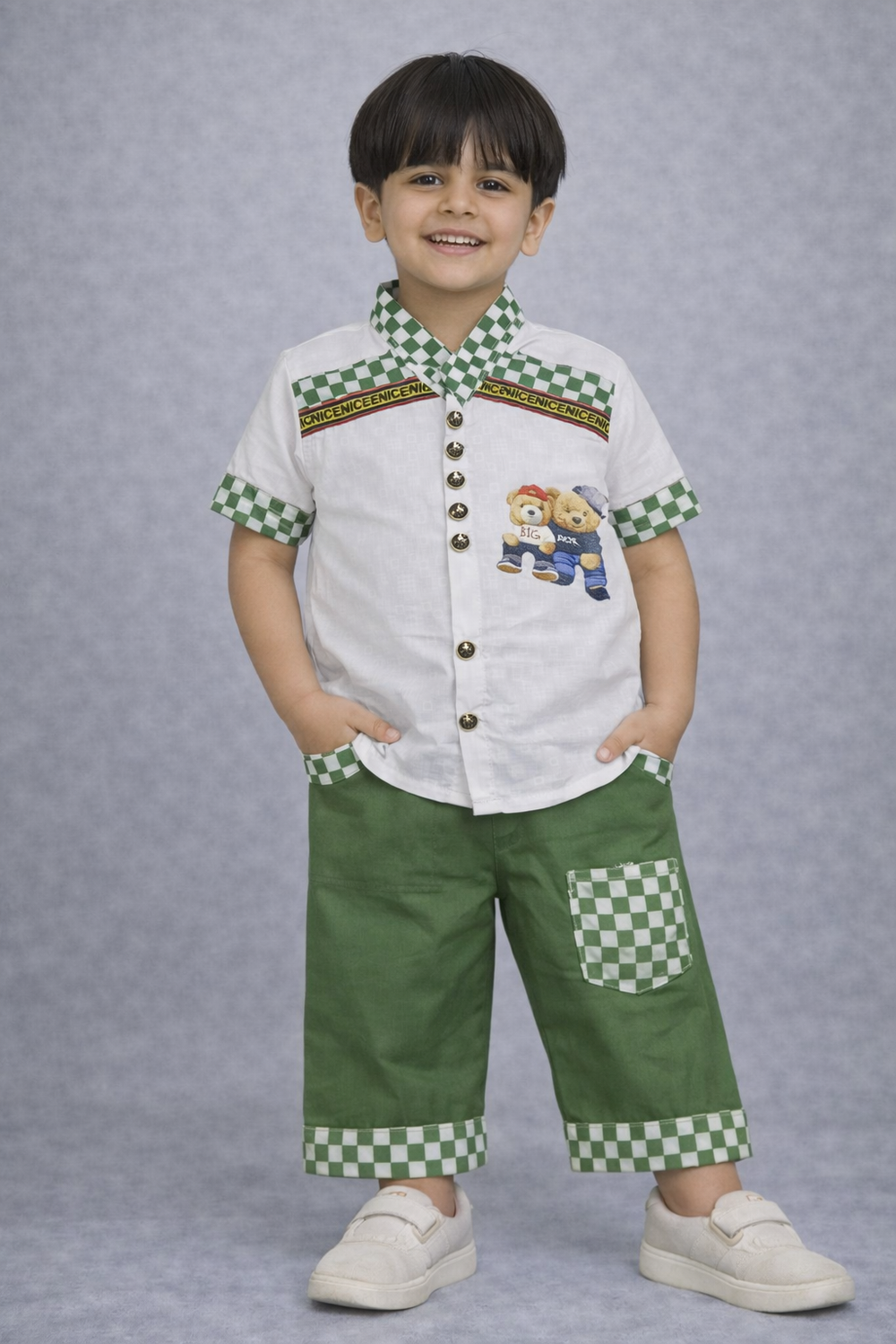 his stylish kids outfit is designed to give a smart and playful look for everyday wear. The shirt features a trendy button-down style with decorative buttons, a cute teddy bear graphic, and attractive patterned details that add a fun and unique touch to the outfit. The soft and comfortable fabric ensures a gentle feel on the skin, making it perfect for active kids.