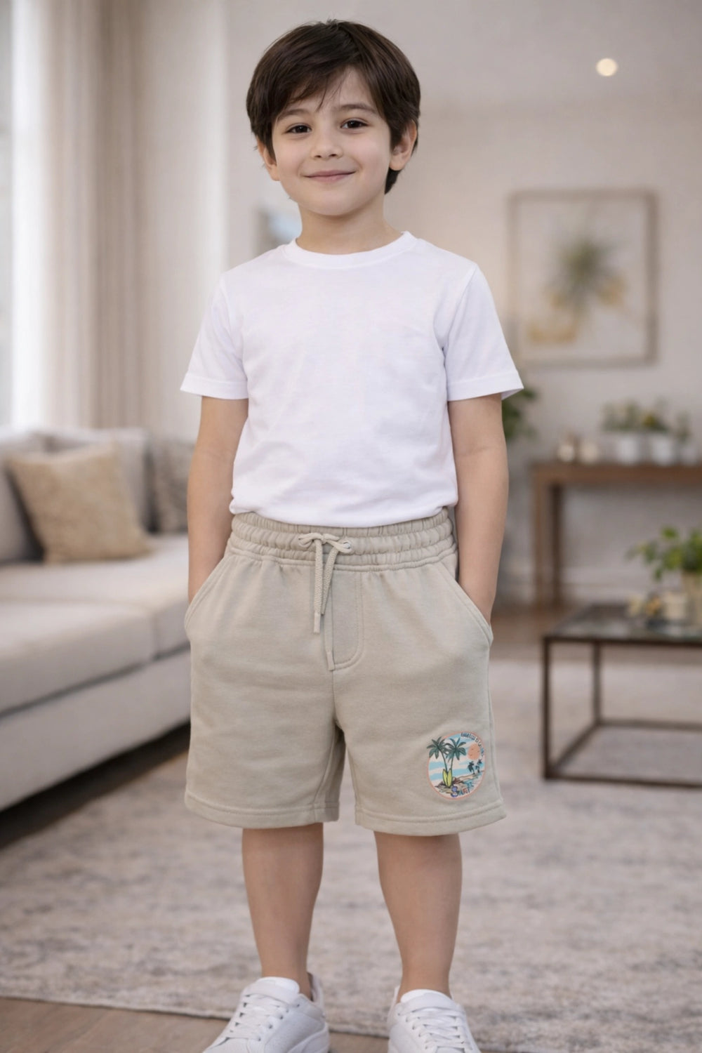 Let your kid enjoy comfort and style with these Boys Beige Cotton Shorts, designed for easy movement and everyday wear. Made from soft, breathable cotton fabric, these shorts feature a cute Paradise Island print, elastic waistband, and adjustable drawstring for a snug fit. Perfect for casual outings, playtime, or summer days.